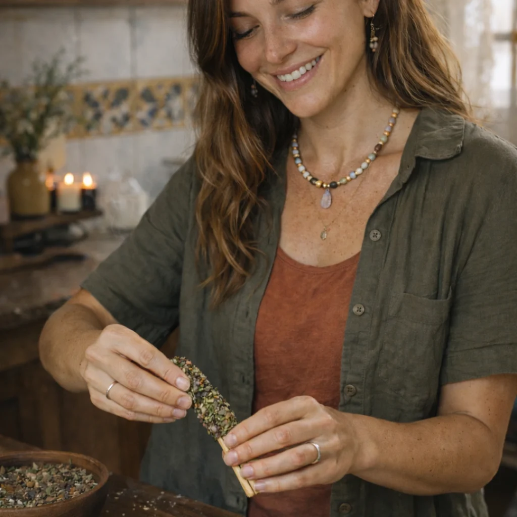 A criadora do Método 3C, Mariana Venturo, se tornou referência no uso de ervas, resinas e pós naturais para a produção de incensos artesanais.
